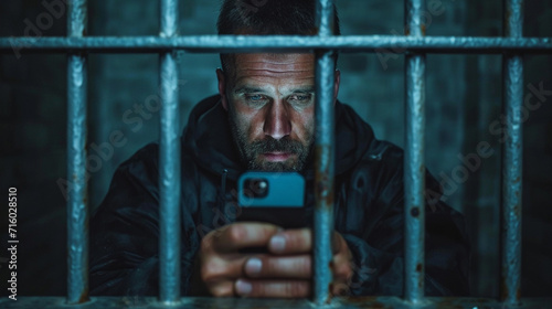 Prisoner behind bars holding phone