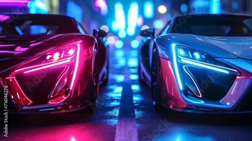 Fierce competition is captured in a startling closeup of two cars sidebyside their neon headlights shining like glinting eyes in the darkness