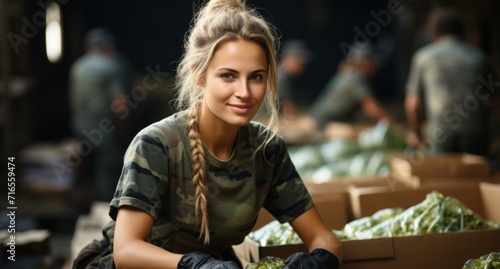 A female military volunteer collects food and equipment into boxes to be sent as humanitarian aid. Concept: organizing logistics and helping the army