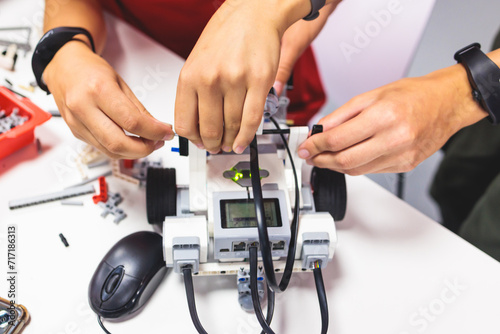Group of diverse children kids with robotic vehicle model, close-up view on hands, science and engineering lesson in a classroom, making, coding and programming a robot in a school, robotics projects