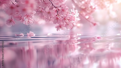 A spring cherry blossom scene, delicate pink sakura flowers, a tranquil pond reflecting the blossoms, serene and poetic atmosphere