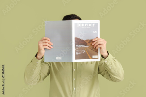 Handsome man reading magazine on green background