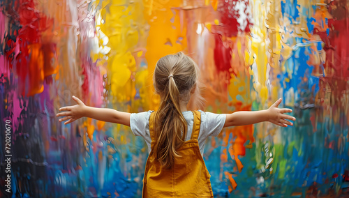 A fashion-forward girl stands before a vibrant mural, her arms open to embrace the bold strokes of acrylic paint and the limitless possibilities of modern art