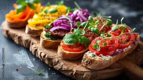 Artisan open-faced sandwiches on a rustic wooden board