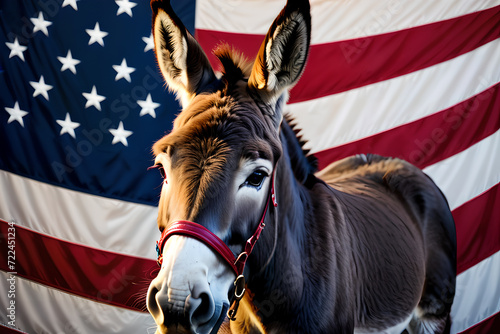 Donkey, as a symbol of the Democratic Party of the United States against the background of the American flag.