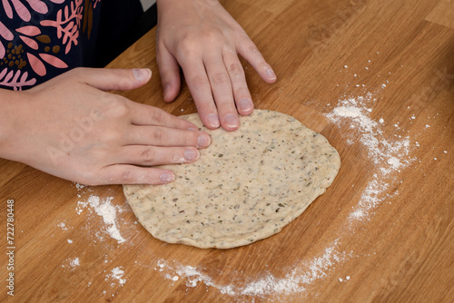 Lepić ciasto, okrągły cienki placek rozgniatany rękami na stolnicy