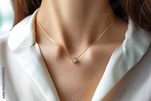 Closeup on the woman wearing a minimal gold and diamond necklace