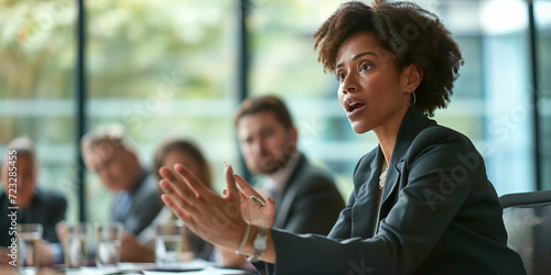 A determined businesswoman engages in a conversation about sustainability, her transparent suit and confident face reflecting her commitment to ethical management