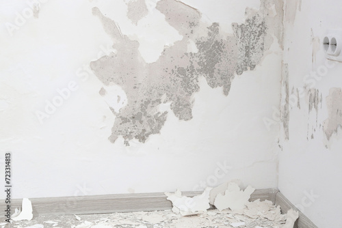 Saltpeter on the wall, Closeup of wall stained with water infiltration. Potassium nitrate, which is present in the building materials comes into contact with oxygen and creates excess moisture