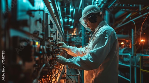 Ein Elektriker in weißem Overall, Schutzhelm und Gehörschutz prüft und misst den funktionierenden modernen Generatormotor