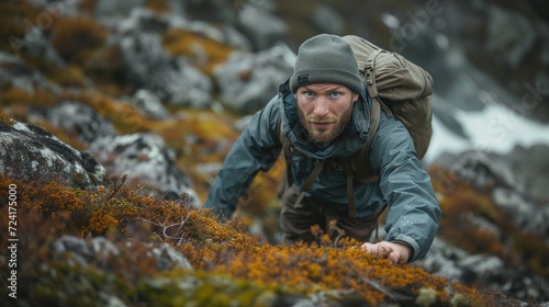 Determined hiker climbing rocky terrain in a misty mountain setting