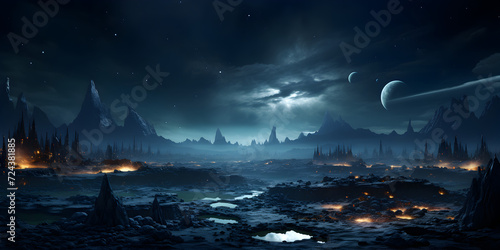 Surface of dark planet with moon in space