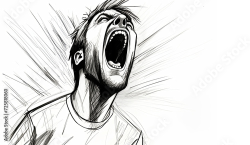 man shouting in anger. black and white drawing illustration on white background with copy space. AI generated