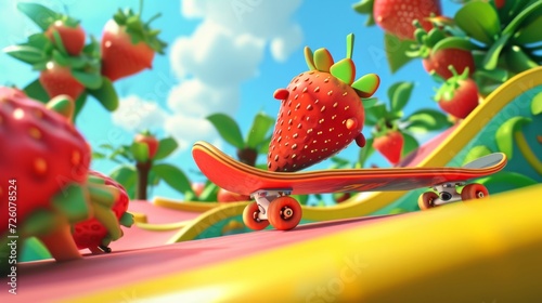 In a strange twist of fate the tables have turned and the skateboard is now the one riding the strawberry. Watch as the board embarks on a crazy journey down the fruity ramp