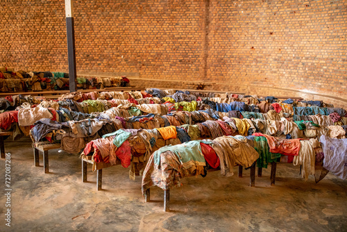 Nyamata Genocide Memorial Center, Nyamata, Rwanda. Victims' clothes on church pews