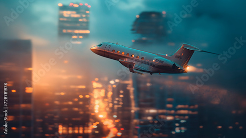 Vista aérea de un jet privado volando cerca de edificios de una ciudad al atardecer