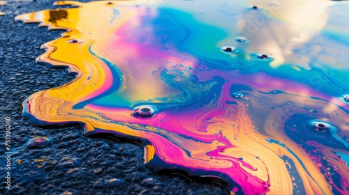 Zoomed-in view of an oil spill on asphalt, showcasing the rainbow sheen and urban texture