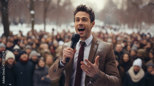 A businessman anchor standing in front of the public with a microphone.