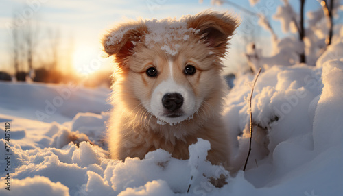 Cute puppy playing in the snow, nature fluffy friend generated by AI