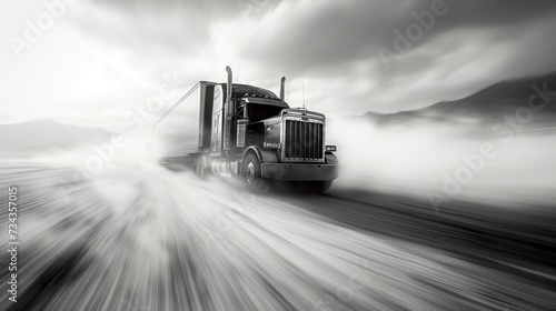 Truck Transportation logistics highlighted by a powerful black truck in city motion blur, representing rapid transit, metropolitan freight services, and streamlined truck transportation logistics.