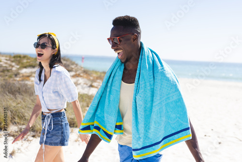 Young biracial woman and African American man enjoy a sunny beach day