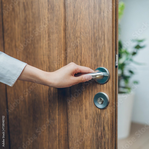 #987139766A man's hand on a steel door handle. Swinging interior door