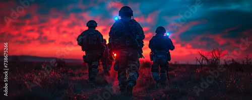 Tactical strike team moving out at dusk their path lit by blue and red tactical lights ready for modern warfare