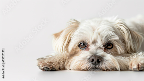 The studio portrait of bored dog maltese lying isolated on white background with copy space for text.