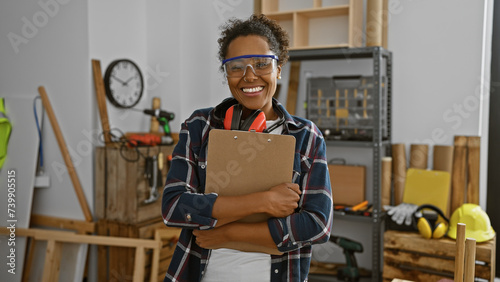 Smiling woman with safety goggles and headphones holding a clipboard in a carpentry workshop