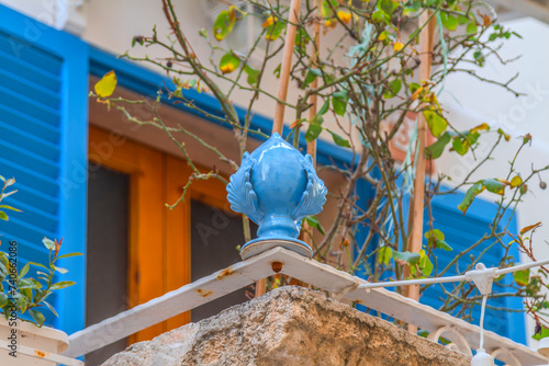 tradycyjny włoski balkon a dekoracja charakterystyczną dla regionu Apulii, niebieskie okiennice