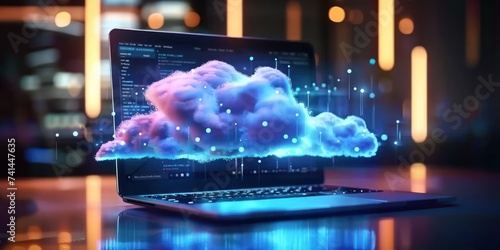 Technology and imagination captures essence of modern data storage solutions whimsical powerful cloud hovers above laptop symbolizing limitless potential of cloud computing