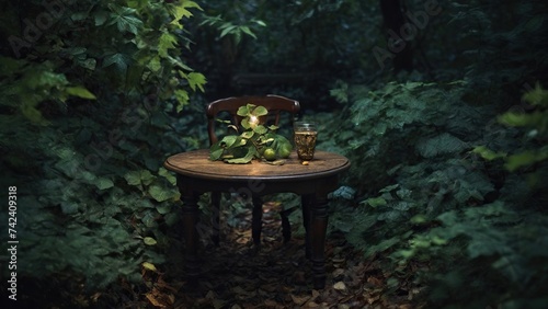 Mystic Woodland Décor: Vintage Table in Mossy Surroundings of a Forest