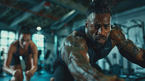 a man and woman working out together in a gym showcasing their strength and determination