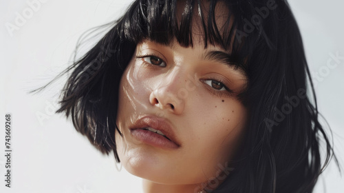 portrait en gros plan d'une jeune femme brune avec une coupe au carré court, fond studio neutre