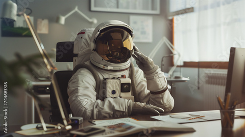 Astronaut in a Modern Office Setting, Contemplating Work, a Metaphor for Strategic Thinking and Planning