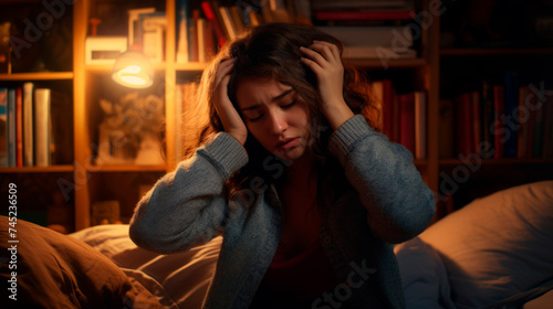A visibly upset woman sits in bed, clutching her head under the glow of a warm lamp, her posture and expression conveying the acute distress of stress or a migraine.