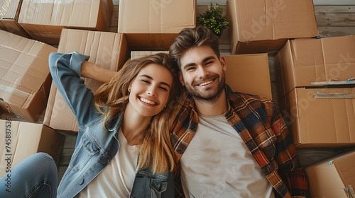 #746631328Young happy married couple in their new home after moving in. Unpacking boxes after moving into a new apartment. New homeowners. Mortgage. Rental of property.