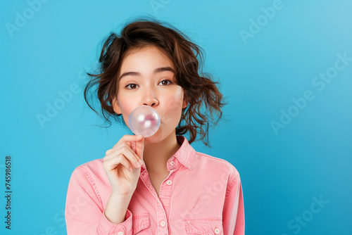 Photo of positive sweet lady dressed shirt arm cheek air blowing empty space isolated blue color background