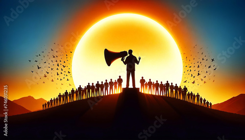 Silhouette of a leader with a megaphone on a hill, addressing a crowd against a stunning sunset backdrop, symbolizing inspiration, leadership, and communication.Communication concept. AI generated.