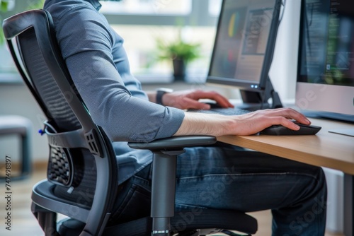 A professional working attentively at a dual-monitor computer setup in a bright and modern office environment.