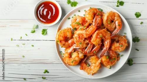 Fried shrimps tempura with sauce on white round plate on a white wooden surface, overhead view. From above, top view, flat lay.
