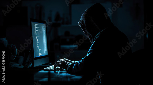 A darkened room where a single computer screen casts light on the silhouette of a person typing possibly wearing a hoodie symbolizing the persistent threat of cyber attacks and cybersecurity
