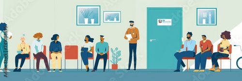 Cartoon illustration of diverse people in waiting room - Illustration depicting a variety of individuals sitting in a waiting room with a colorful and inclusive vibe