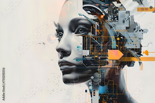 Female robot with abstract tech elements. Digital art collage. Design for poster, banner, social media. Future technology and futurism concept.