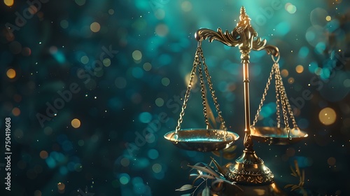 Golden balance scales on a shimmering blue background. symbol of justice and law. ideal for legal concepts and equality themes. representing balance and fairness in style. AI