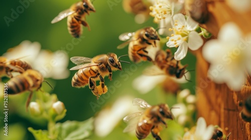 Multiple bees gathering nectar and pollen on various colorful flowers in a garden