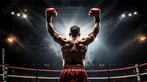 A rear view of a boxing champion enjoying his victory in the lights of the ring. Competitions, Sports, Energy, Healthy lifestyle concepts.