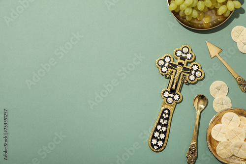 Liturgical bread, cross and grapes on green background, space for text
