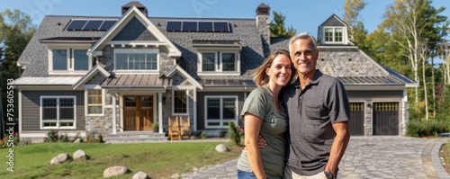 Middle age couple standing in front of their new large house with solar panels on roof.