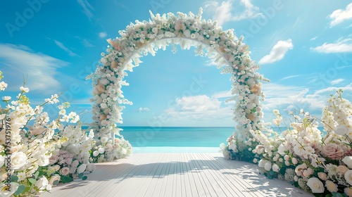 Wedding arch with white flowers at blue ocean